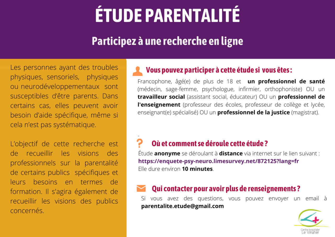 Si vous avez des questions sur les critères d’inclusion/exclusion ou pour tout renseignement complémentaire, vous pouvez envoyer un email àetude.parentalite@gmail.com, qui est une adresse générique créée pour les besoins de l’étude et qui renvoie aux personnes impliquées dans l’étude.