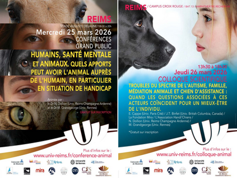 Le 26 mars après-midi (13h30-18h30), sur le Campus Croix Rouge, Université de Reims Champagne Ardenne, se tiendra un colloque scientifique réunissant chercheurs, spécialistes et acteurs de terrain, et personnes concernées autour du thème :« Troubles du Spectre de l’Autisme, Famille, Médiation animale et Chien d’assistance ». Seront notamment présents : John-Tyler Binfet (Univ. British Columbia, CA), Emilie Cappe (Univ. Paris Cité), Nicolas Dollion, Marine Grandgeorge, l’Association Handi’Chiens et la Fondation Mira.
