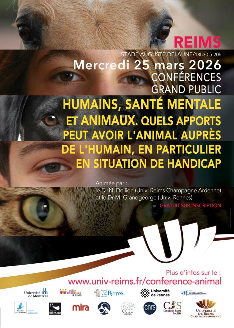 Le 25 mars (18h30-20h30), se tiendra au stade Auguste-Delaune de Reims une conférence grand public intitulée :« Humains, santé mentale et animaux : quels apports peut avoir l’animal auprès de l’humain, en particulier en situation de handicap ? », coanimée par le Dr Nicolas Dollion (Université de Reims Champagne-Ardenne) et le Dr Marine Grandgeorge (Université de Rennes).