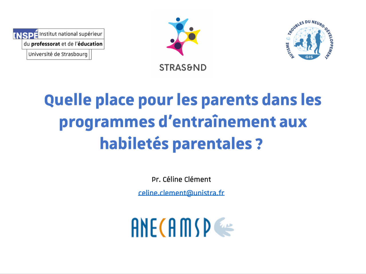 Le Pr Céline Clément (coordinatrice Axe SHS Stras&ND) y a tenu un conférence sur « la place des parents dans les programmes d’entrainement aux habiletés parentales ».
