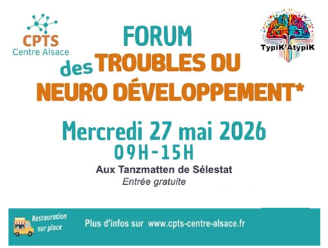 Selestat , FranceL'association Typik'atypik organise cette journée d'informations sur les TND en partenariat avec la CPTS Centre Alsace. Quand: le mercredi 27 mai de 9h à 15h Où: Au Tanzmatten de Sélestat Informations et insriptions: https://www.helloasso.com/associations/cpts-centre-alsace/evenements/inscription-forum-des-troubles-du-neurodeveloppement-du-27-05-2026?fbclid=IwY2xjawQT4MpleHRuA2FlbQIxMABicmlkETFoSTJ6Z2FzVDBGekRMQVVkc3J0YwZhcHBfaWQQMjIyMDM5MTc4ODIwMDg5MgABHmGbWzIc7SN7KEgQRMOd7_AugnfcqN6ohTFrzZcKFtBylISTnaI5ge9qBFAE_aem_TlSSoXPdf0IL_2YFynM-PQ