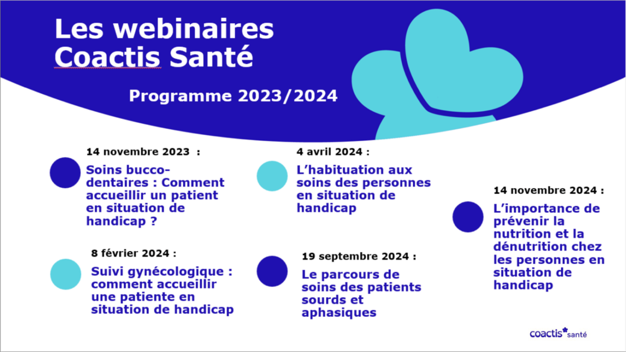 Depuis la rentrée 2023, Coactis Santé organise des Webinaires en lien avec des thématiques qui concernent la santé, le handicap et l’accessibilité (webinaires gratuits et sur inscription).
